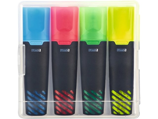 Набор жидких текстовых выделителей, состоящий из 4 маркеров LIQEO HIGHLIGHTER в прозрачной пластиковой упаковке. Стандартные цвета текстовых выделителей: желтый, зеленый, пурпурный и синий. УФ-печать (УФ-печать цветные изделия) на данный товар рассчитывается индивидуально. При расчете стоимости нанесения в неё будет включена настройка оборудования в размере 1500 рублей на весь тираж.
