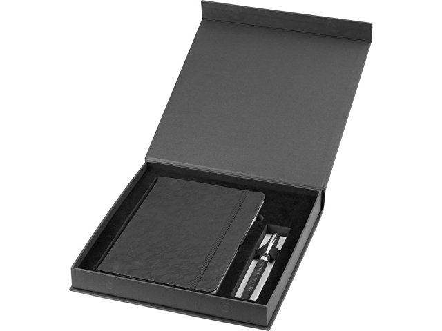 Подарочный набор, состоящий из блокнота формата А5 с кружевной твердой обложкой, лентой-закладкой, эластичной застежкой, петелькой для ручки, 96 листами линованной бумаги (плотностью 80 г/м2), который сочетается с подходящей по дизайну ручкой-роллером с черным стержнем премиального качества. Упакован в подарочную коробку LUXE.